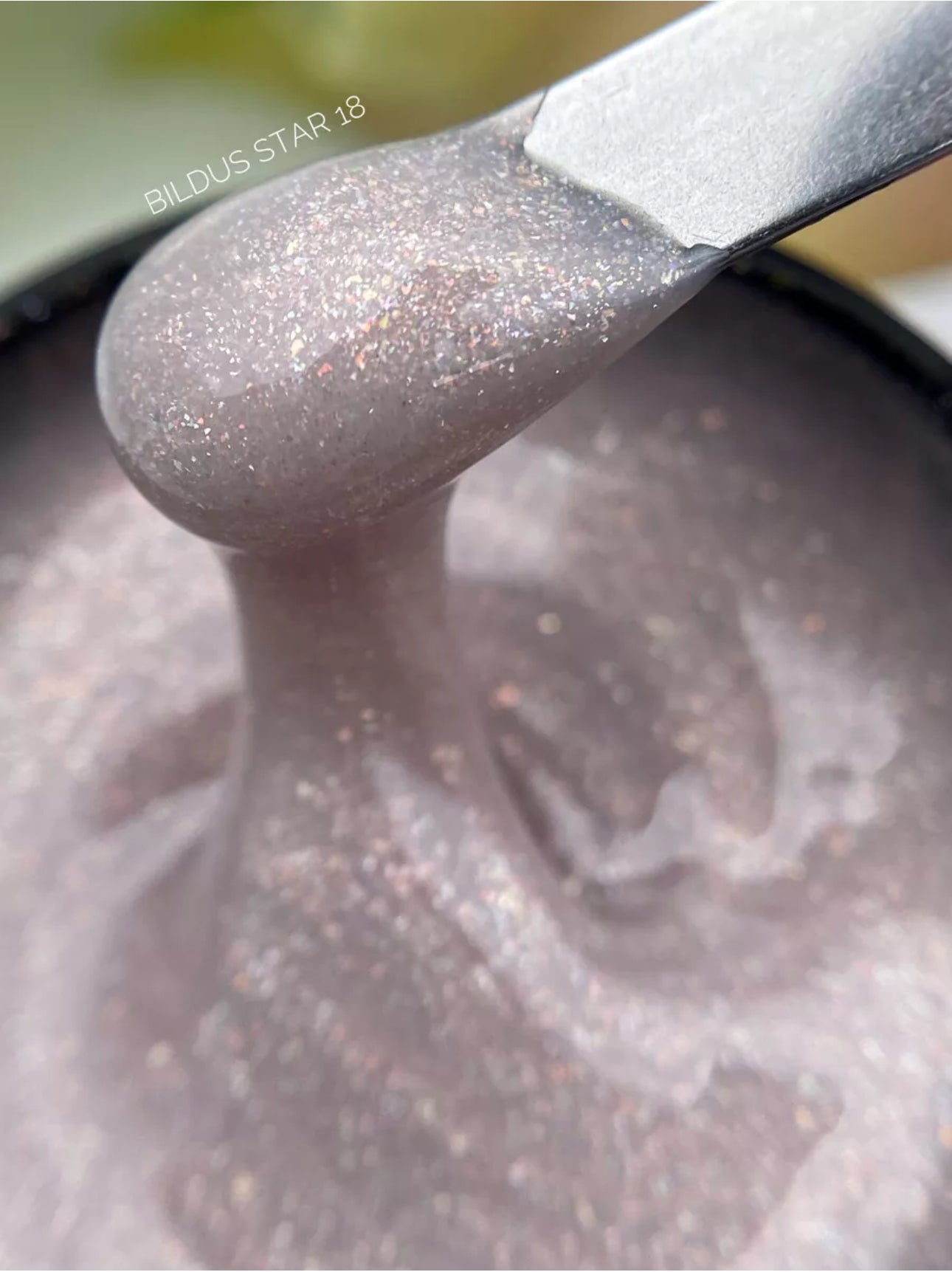 ✔️ Shade: Bildus Star Gel №19 – semi-transparent warm beige rose with fine chameleon flakes