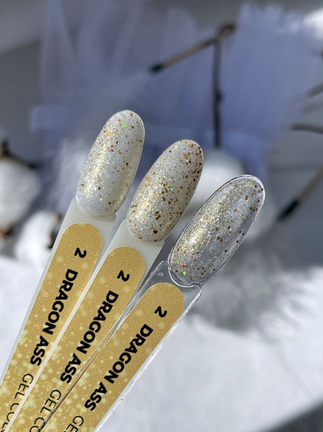 ✔️ Shade: Dragon Ass Gel №2 – White base with bright golden glitter accents.