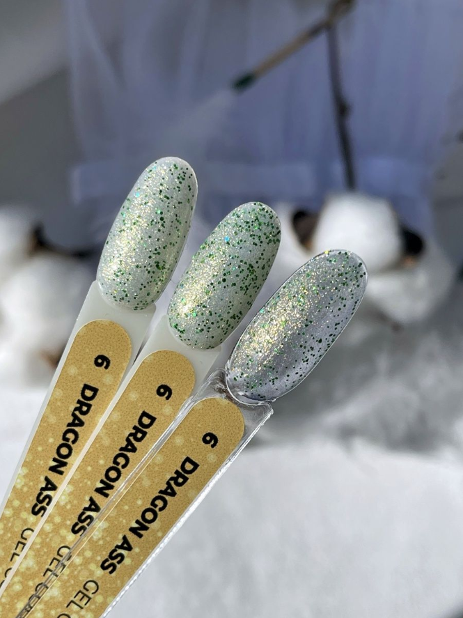 ✔️ Shade: Dragon Ass Gel №6 – White base with green glitter flakes.