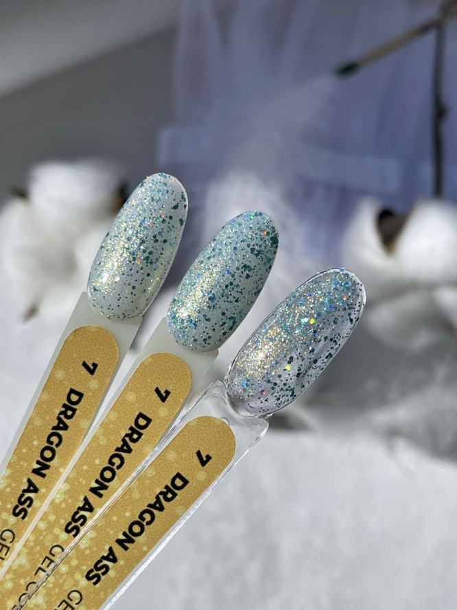 ✔️ Shade: Dragon Ass Gel №7 – White base with aqua-blue glitter sparkle.