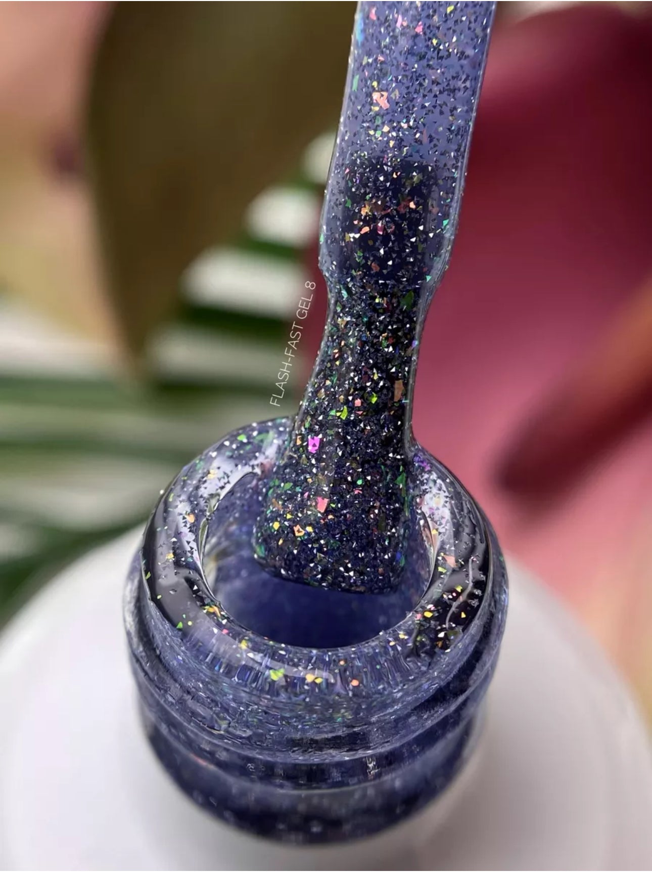 ✔️ Shade: Flash-Fast Gel №8 – semi-transparent periwinkle blue with reflective micro-shimmer