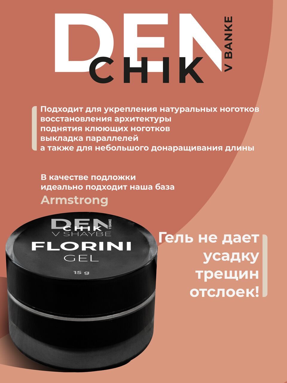 The Florini Gel series by Denchik_v_banke features 8 elegant builder gels with a translucent base, delicate shimmer, and decorative flakes in various shades. This formula is perfect for strengthening natural nails, restoring architecture, lifting downward-growing nails, and small extensions up to 2mm. The medium-thick consistency ensures smooth application without running, shrinkage, or lifting, making it suitable for both beginners and professionals. Works perfectly over Armstrong Rubber Base.