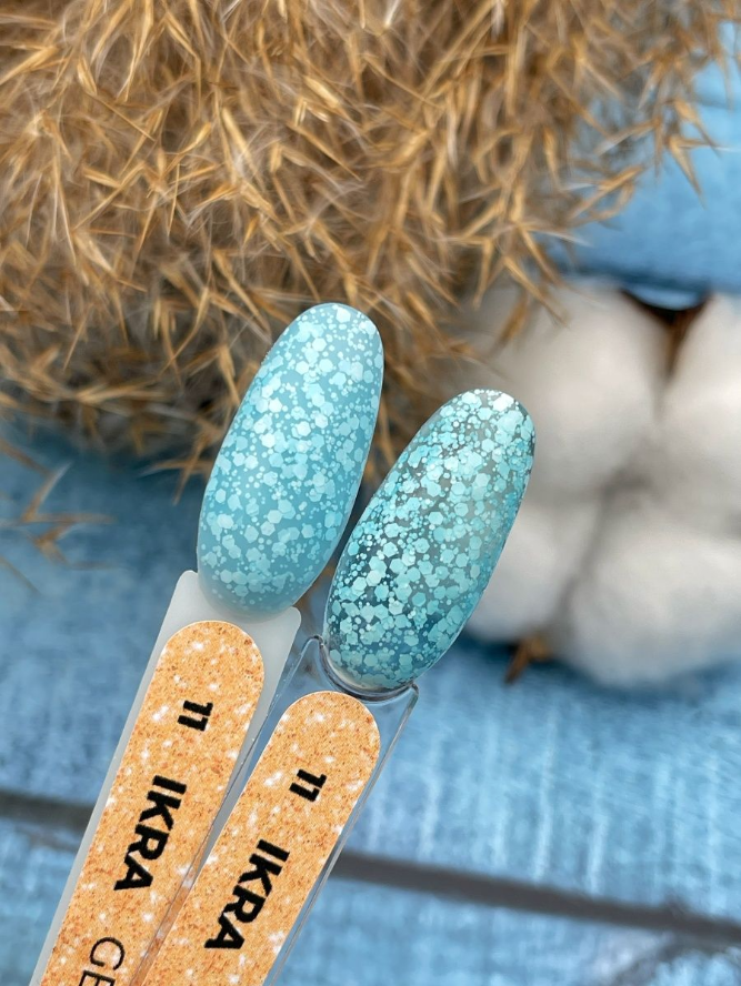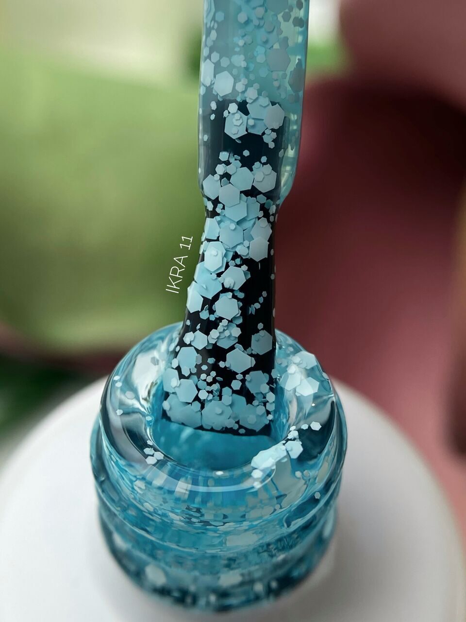 ✔️ Shade: Ikra Gel Polish №11 – Aqua blue with light blue speckled “caviar” effect, medium opacity.