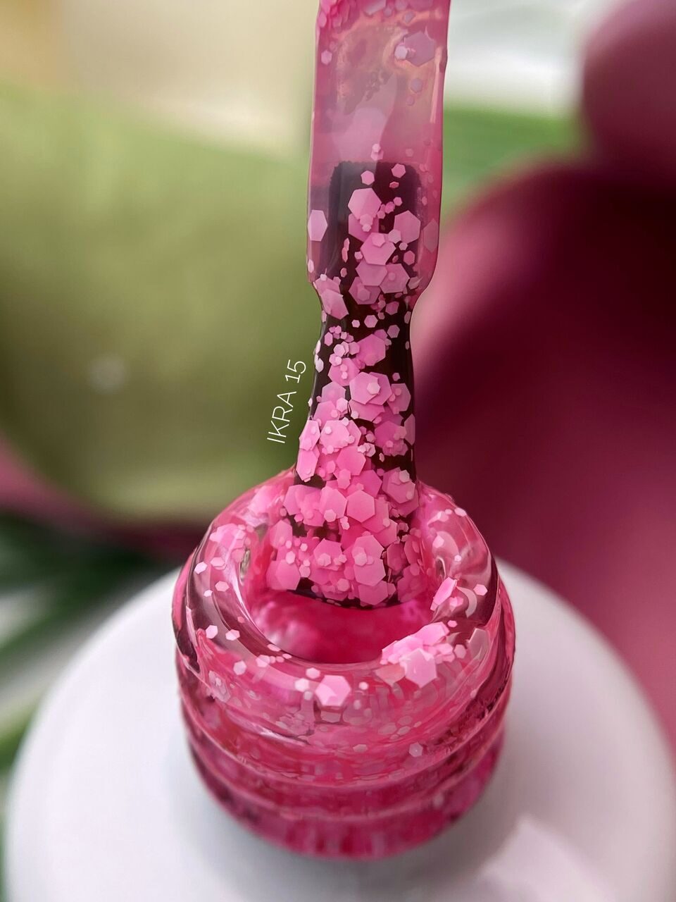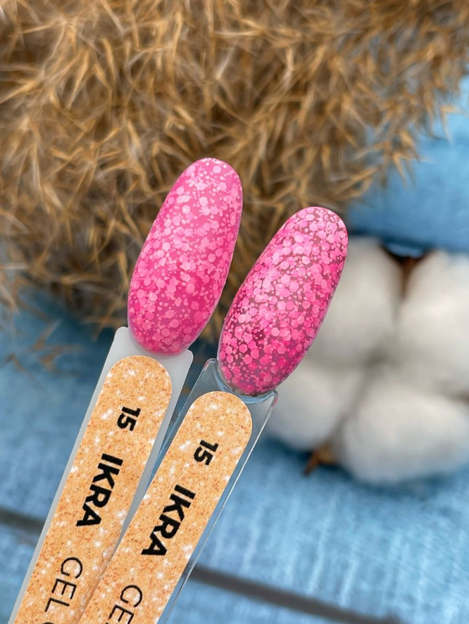 ✔️ Shade: Ikra Gel Polish №15 – Bright fuchsia pink with speckles, bold opaque look.