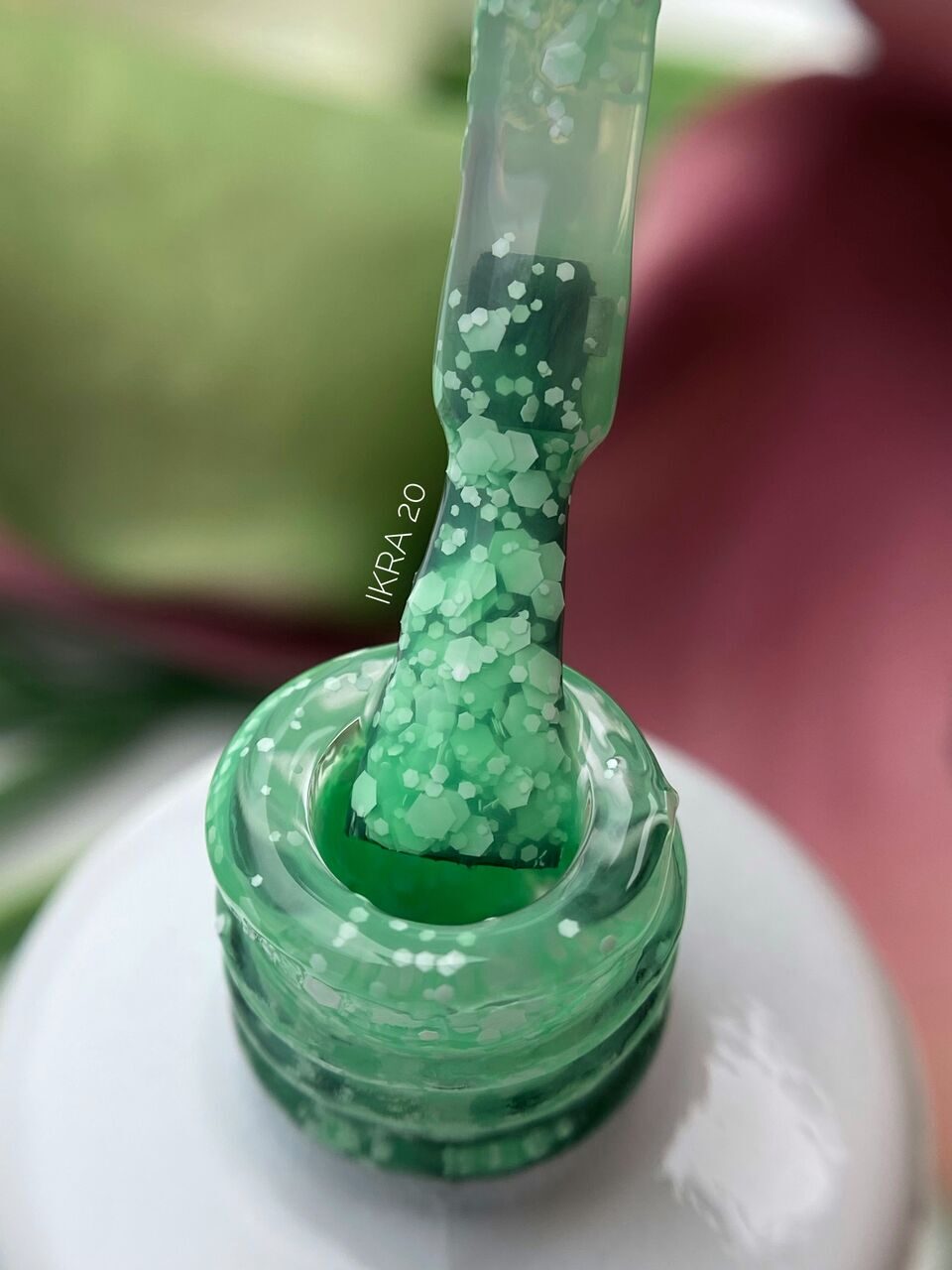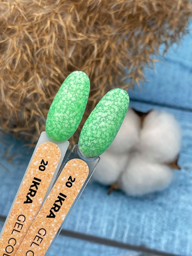 ✔️ Shade: Ikra Gel Polish №20 – Bright green pastel with speckled finish, opaque coverage.