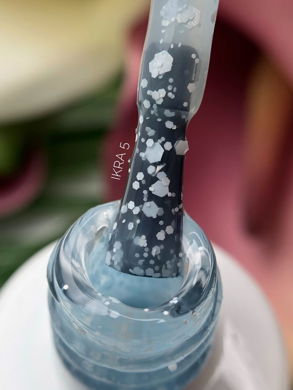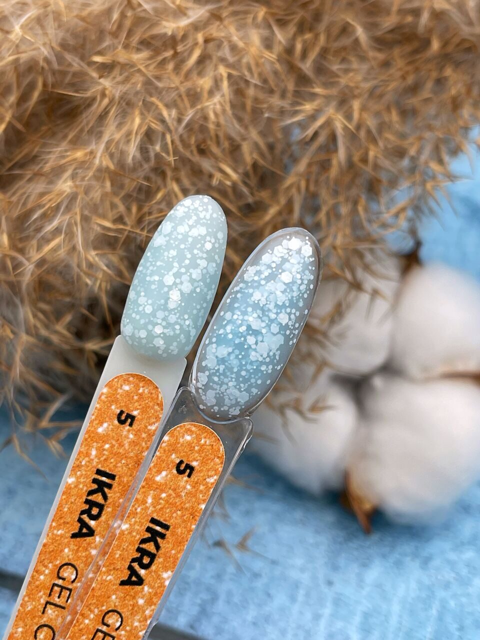 ✔️ Shade: Ikra Gel Polish №5 – Light sky blue with speckled texture, soft semi-transparent look.