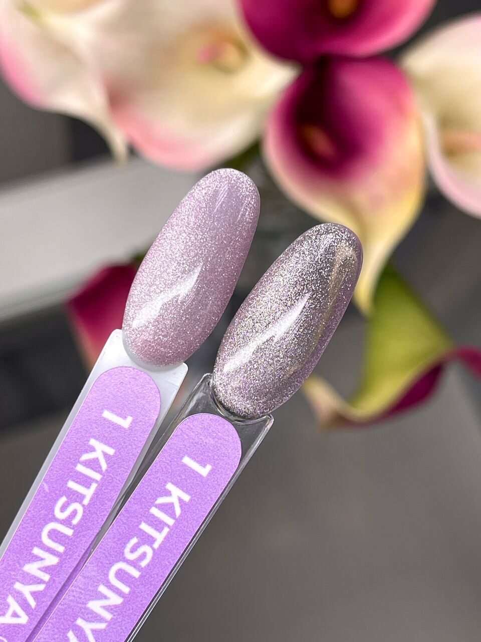 ✔️ Shade: Kitsunya Gel Polish №1 – Soft lavender shimmer with subtle sparkle, medium opacity.