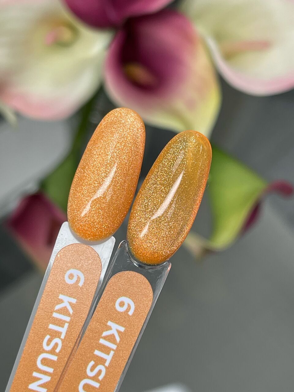 ✔️ Shade: Kitsunya Gel Polish №6 – Warm orange shimmer with smooth metallic effect, opaque finish.