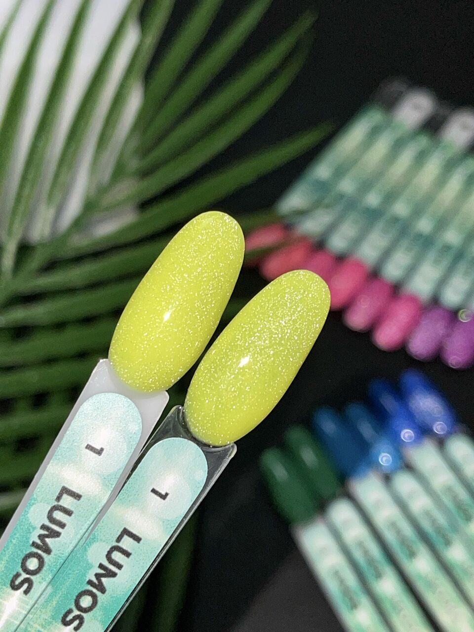 ✔️ Shade: Lumos Maxima Gel Polish №1 – Bright lime green with sparkling shimmer, full opaque coverage.