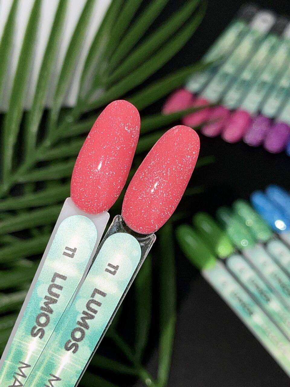 ✔️ Shade: Lumos Maxima Gel Polish №11 – Neon coral-red with sparkling glow, opaque coverage.