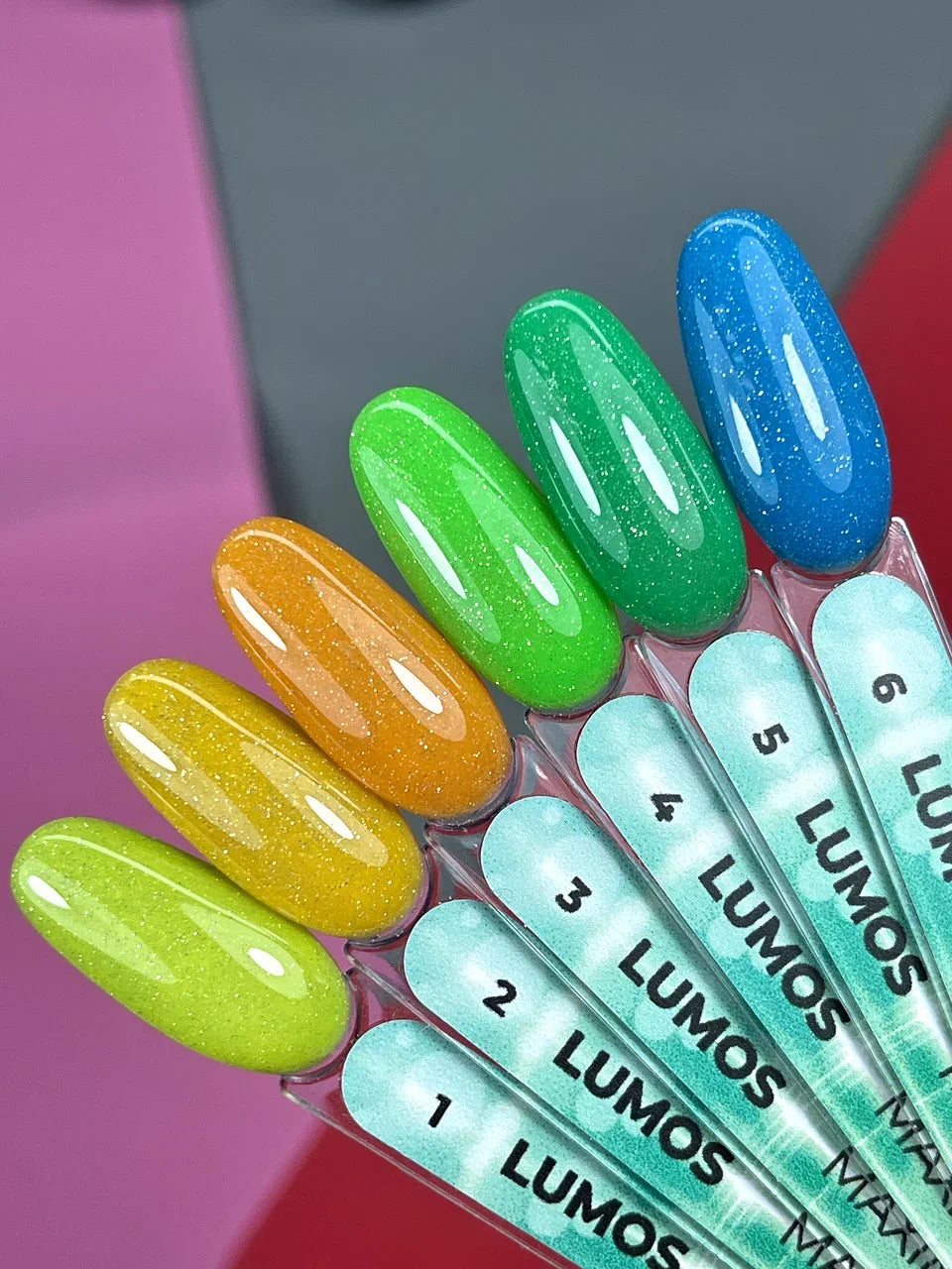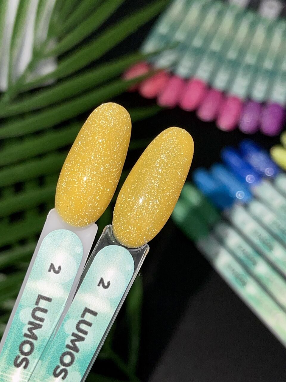 ✔️ Shade: Lumos Maxima Gel Polish №2 – Fresh citrus yellow with luminous glitter, semi-opaque coverage.