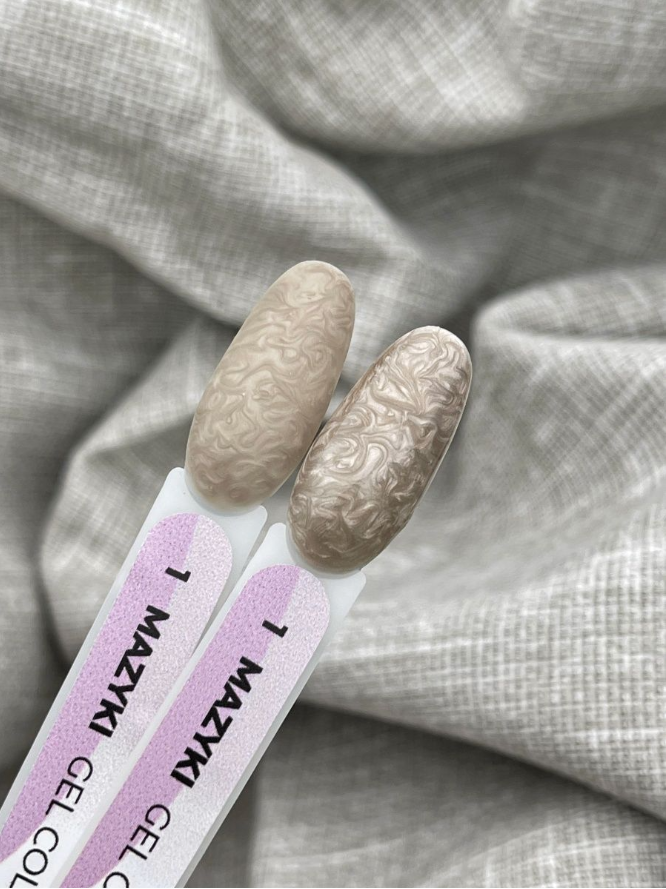 ✔️ Shade: Mazyki Gel Polish №1 – Warm beige-greige with soft marble swirl, semi-opaque coverage.