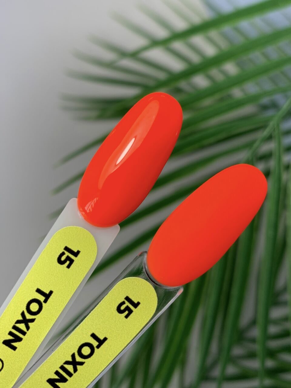 ✔️ Shade: Toxin Gel Polish №15 – Neon orange, cream finish, opaque.