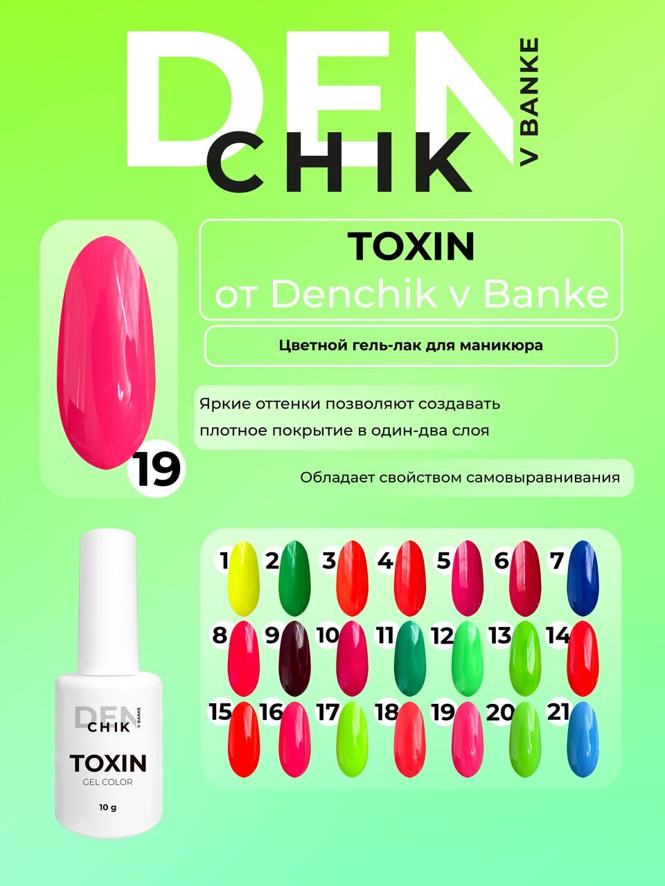 The Toxin Gel Polish collection from Denchik_v_banke includes 21 bright, modern shades inspired by neon and fashion-forward tones. Designed for even, full coverage in 1–2 layers, these gel polishes feature a smooth self-leveling formula that prevents flooding of cuticles and sidewalls. The high pigment load ensures bold, saturated color with a glossy finish.