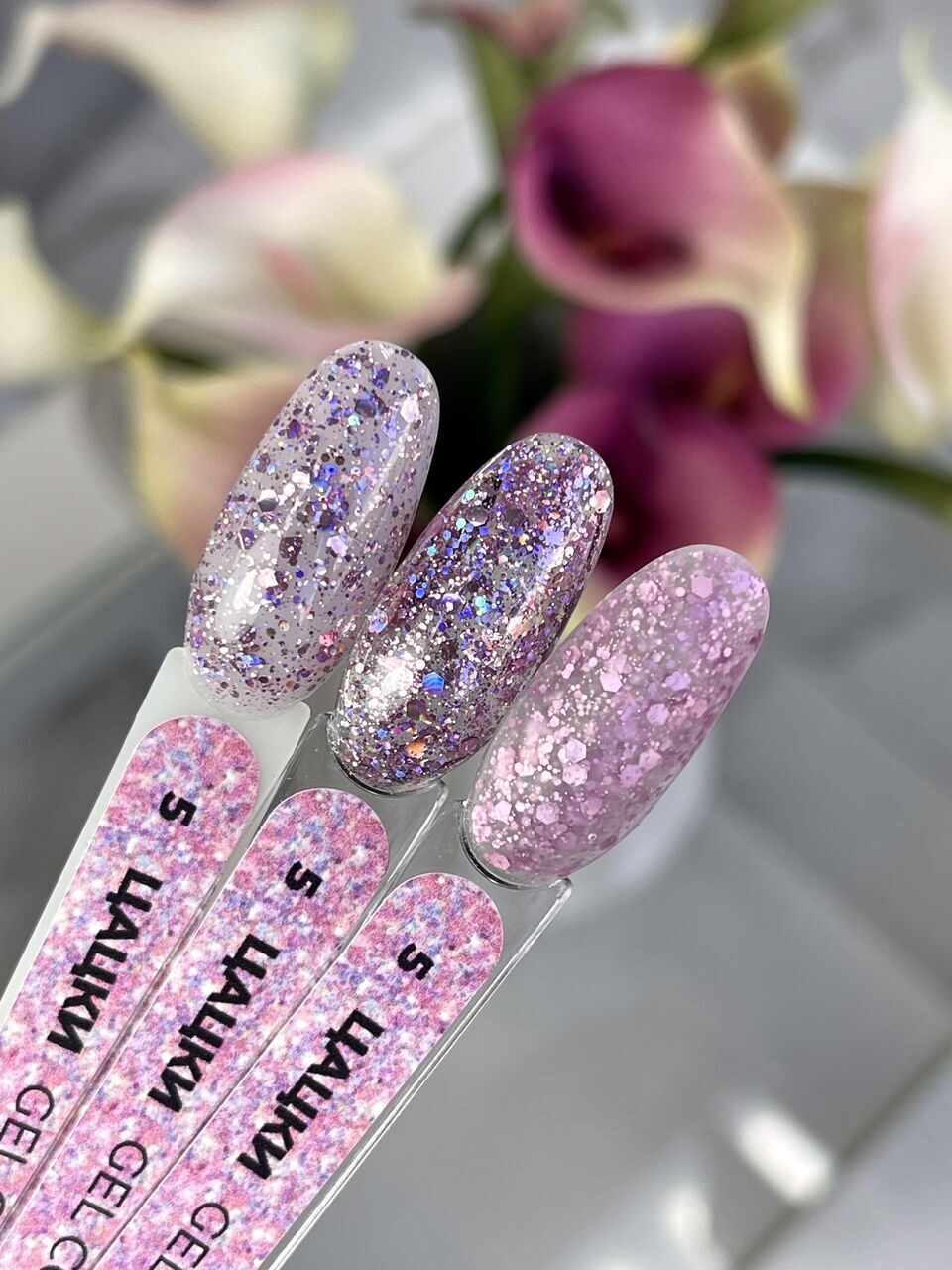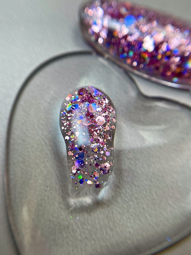 ✔️ Shade: Tsatski Gel Polish №5 – Pink-purple glitter mix with holographic accents.
