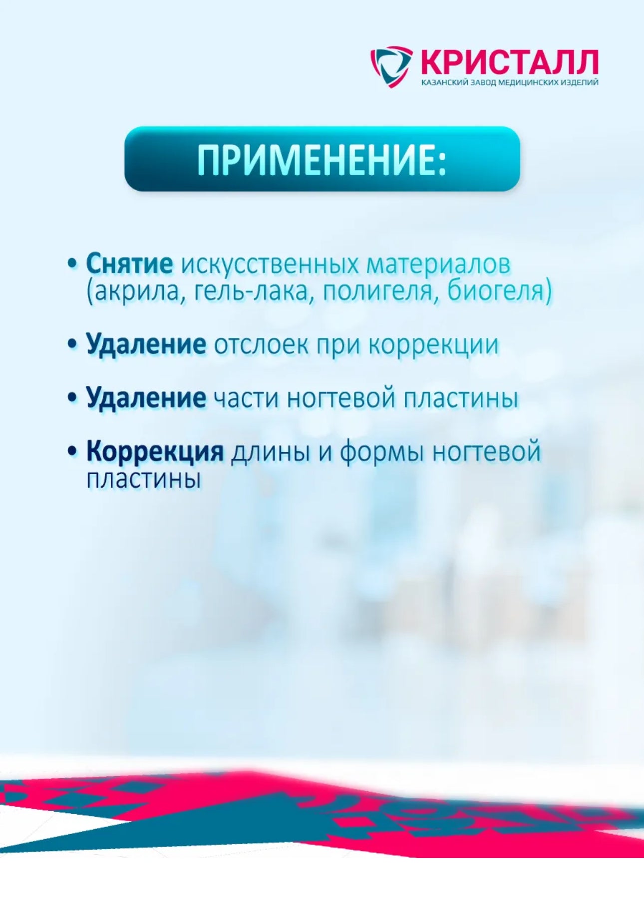 • Purpose: Remove artificial coatings (gel polish, acrylic, polygel, biogel); Correct nail length and shape; Eliminate lifting during refill